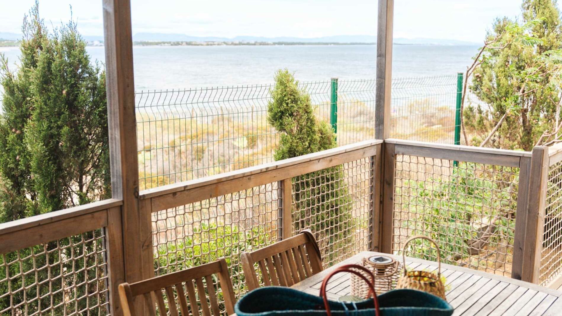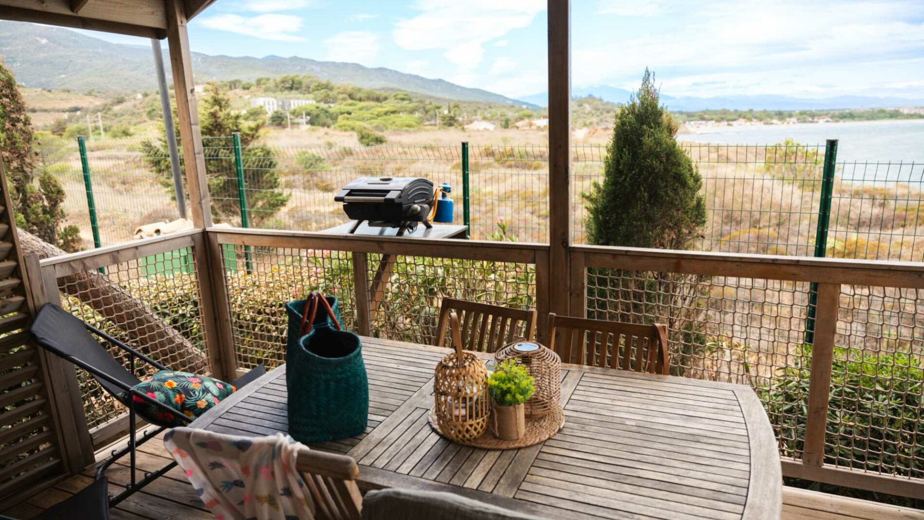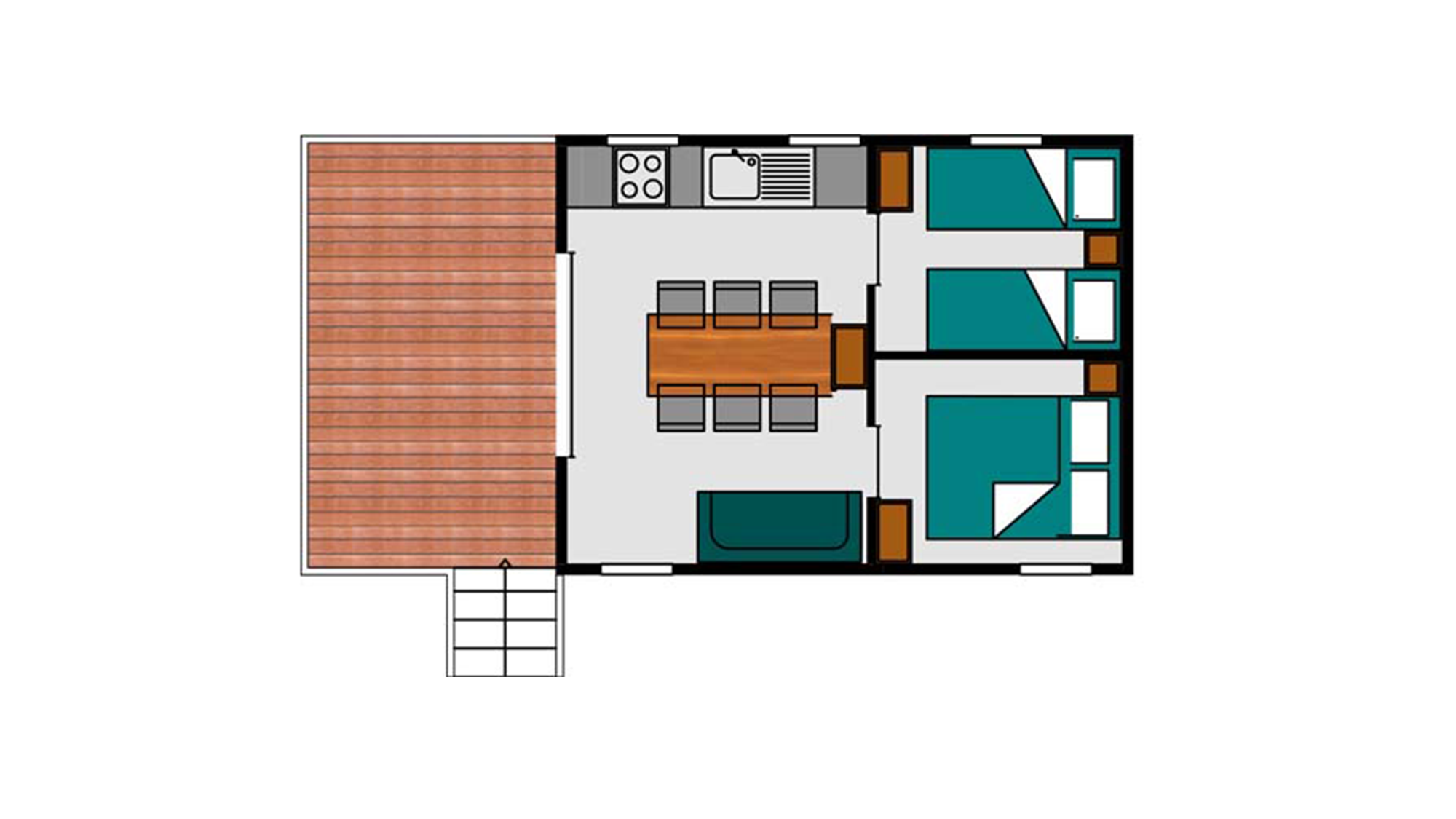 24 m² + 10 m² Überdachte Terrasse. Ein Zimmer mit einem Doppelbett (140×190), ein Zimmer mit zwei Einzelbetten (80×190), 1 Sitzecke ausziehbar für zwei Personen (140×190). Vollständig ausgestattete Küche. Holzmöbel für den Außenbereich.