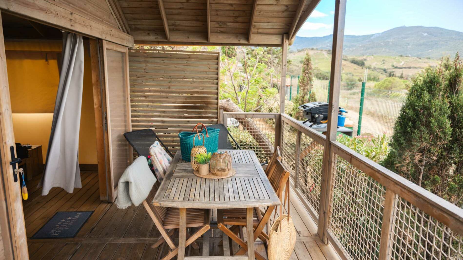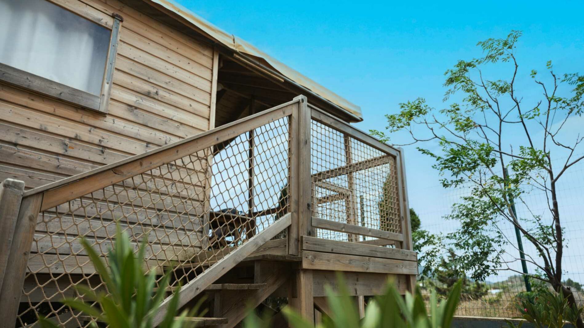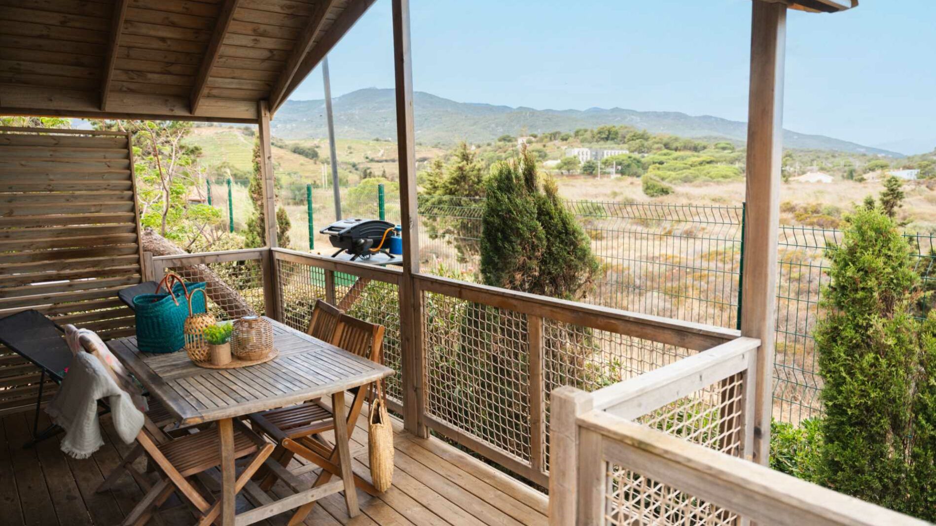 24 m² + 10 m² Überdachte Terrasse. Ein Zimmer mit einem Doppelbett (140×190), ein Zimmer mit zwei Einzelbetten (80×190), 1 Sitzecke ausziehbar für zwei Personen (140×190). Vollständig ausgestattete Küche. Holzmöbel für den Außenbereich.