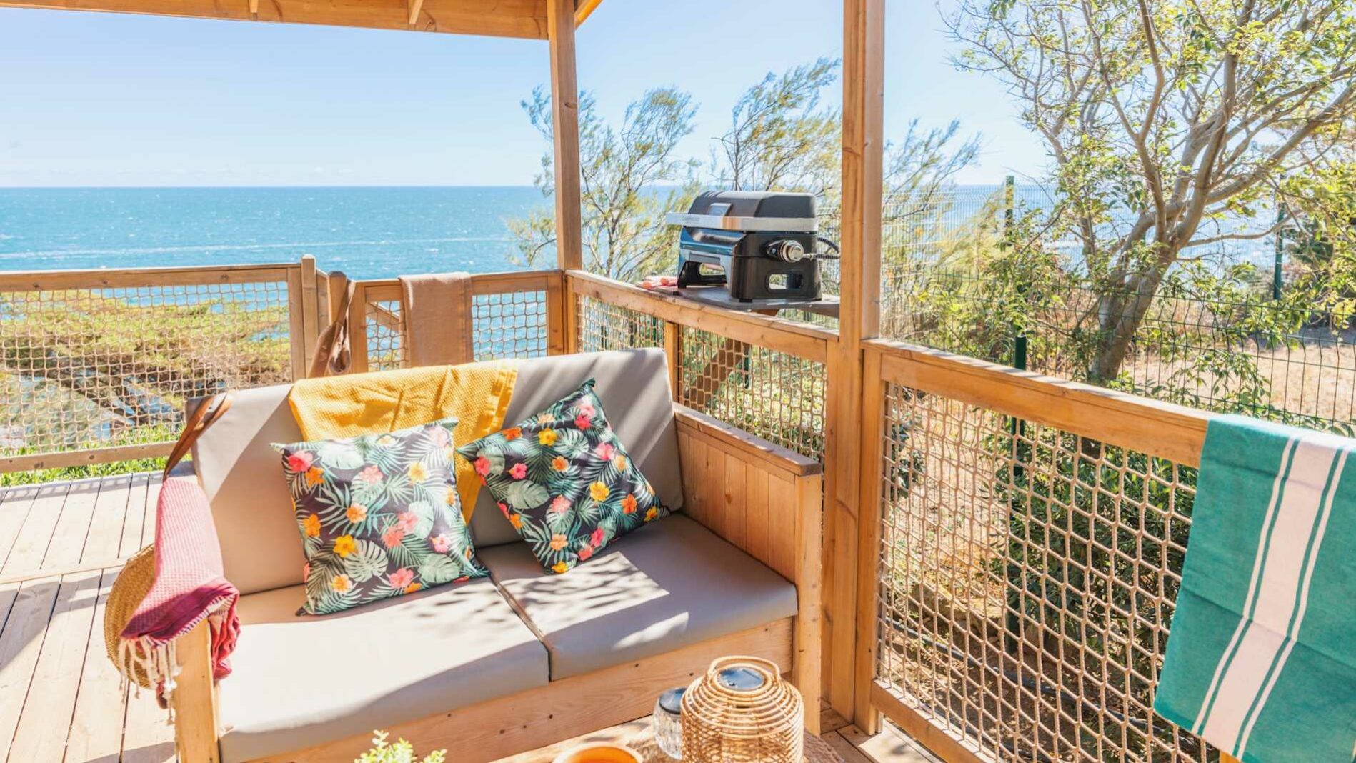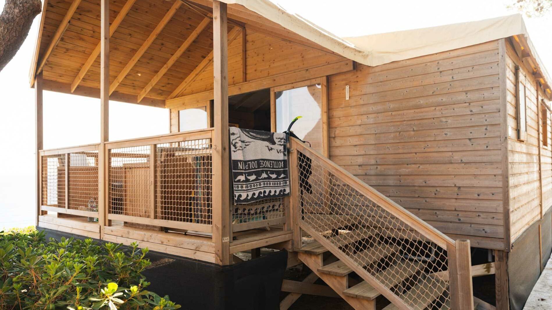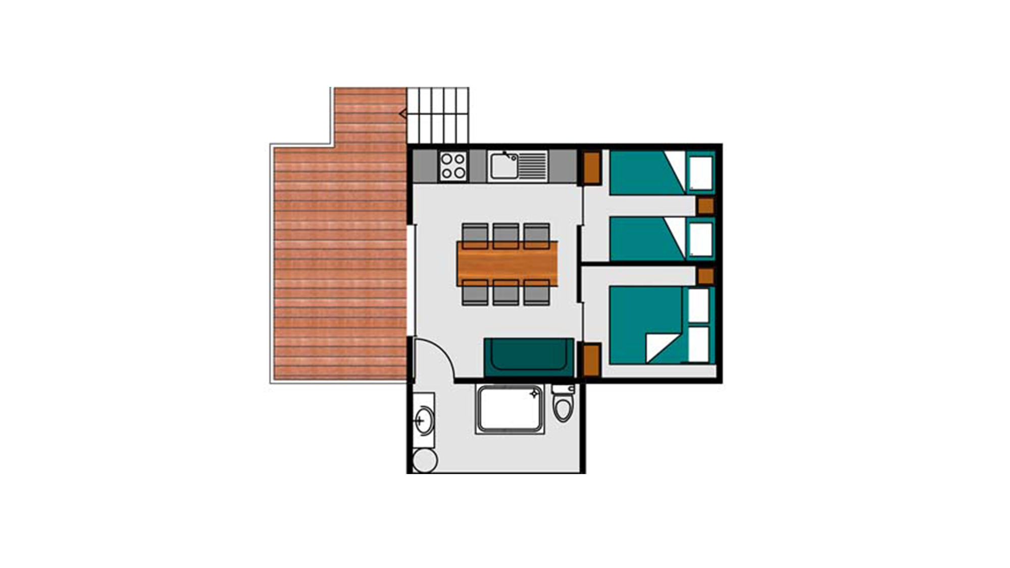 27 m² + 10 m² Überdachte Terrasse. Ein Zimmer mit einem Doppelbett (140×190), ein Zimmer mit zwei Einzelbetten (80×190), eine ausziehbare Sitzecke für zwei Personen (140×190). Vollständig ausgestattete Küche. Ein Badezimmer mit Waschbecken, Dusche und WC. Holzmöbel für den Außenbereich.