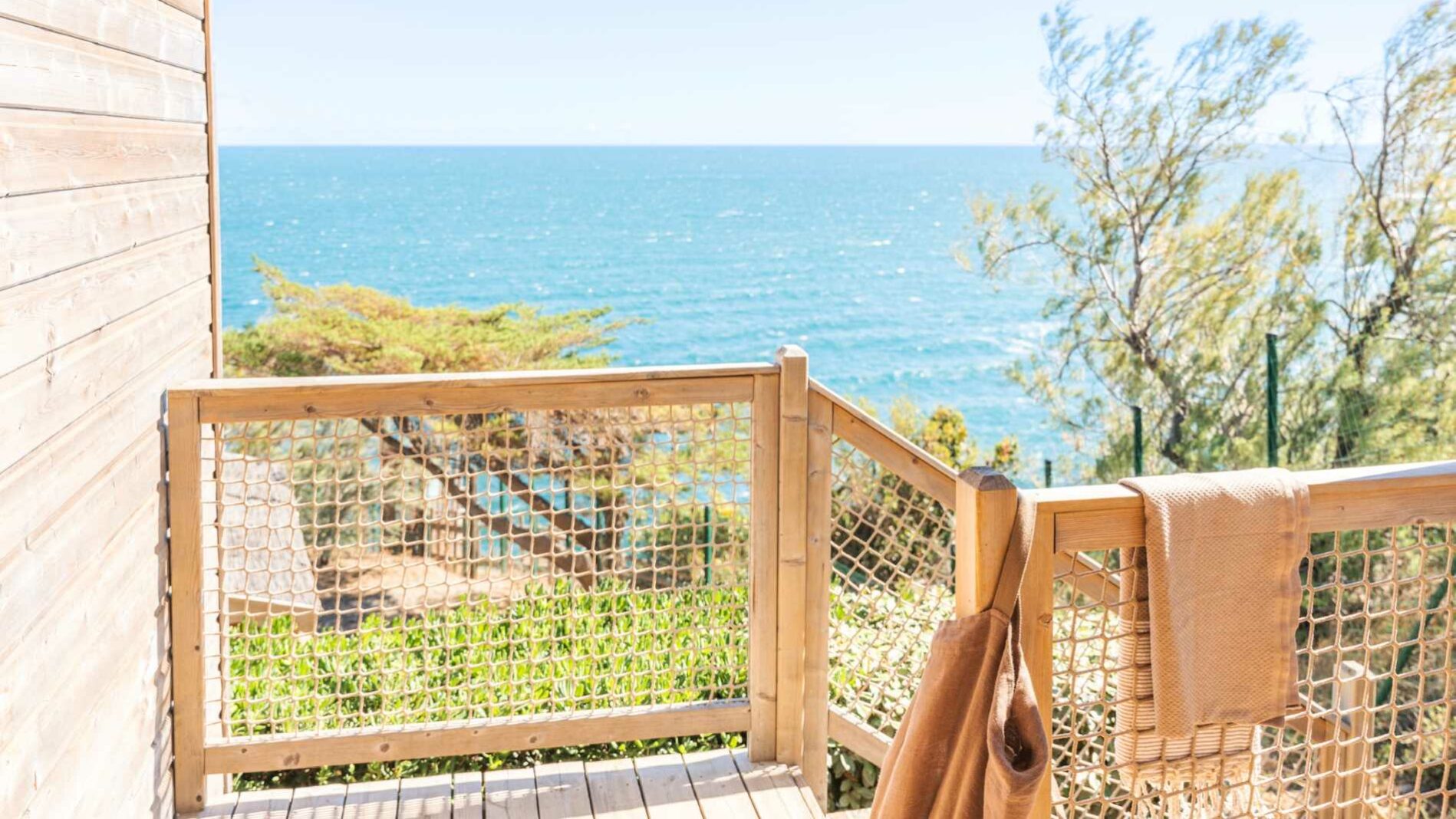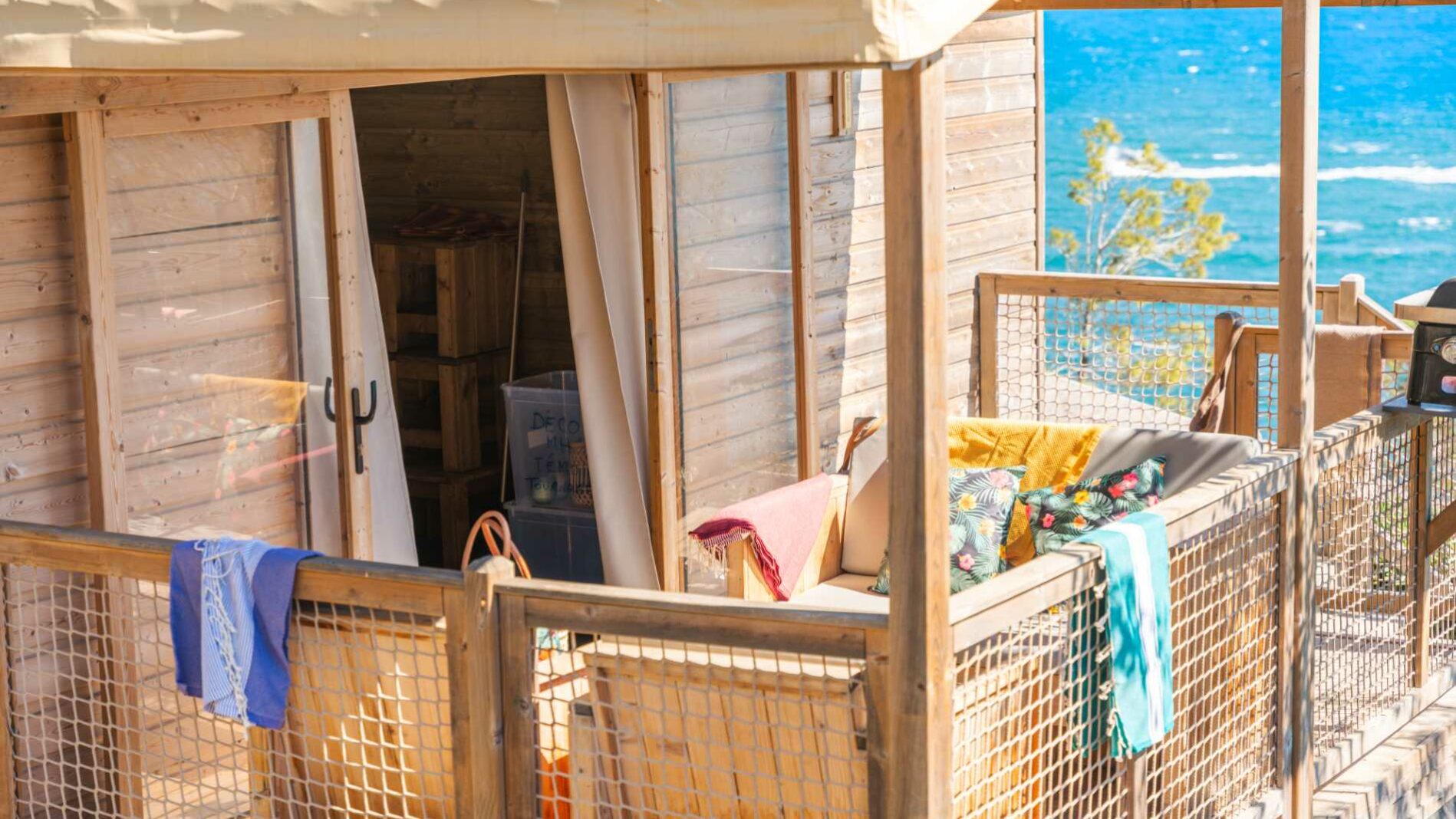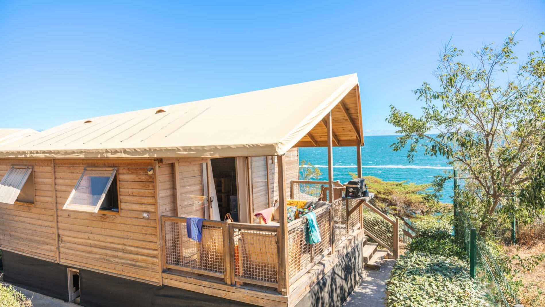 27 m² + 10 m² Überdachte Terrasse. Ein Zimmer mit einem Doppelbett (140×190), ein Zimmer mit zwei Einzelbetten (80×190), eine ausziehbare Sitzecke für zwei Personen (140×190). Vollständig ausgestattete Küche. Ein Badezimmer mit Waschbecken, Dusche und WC. Holzmöbel für den Außenbereich.