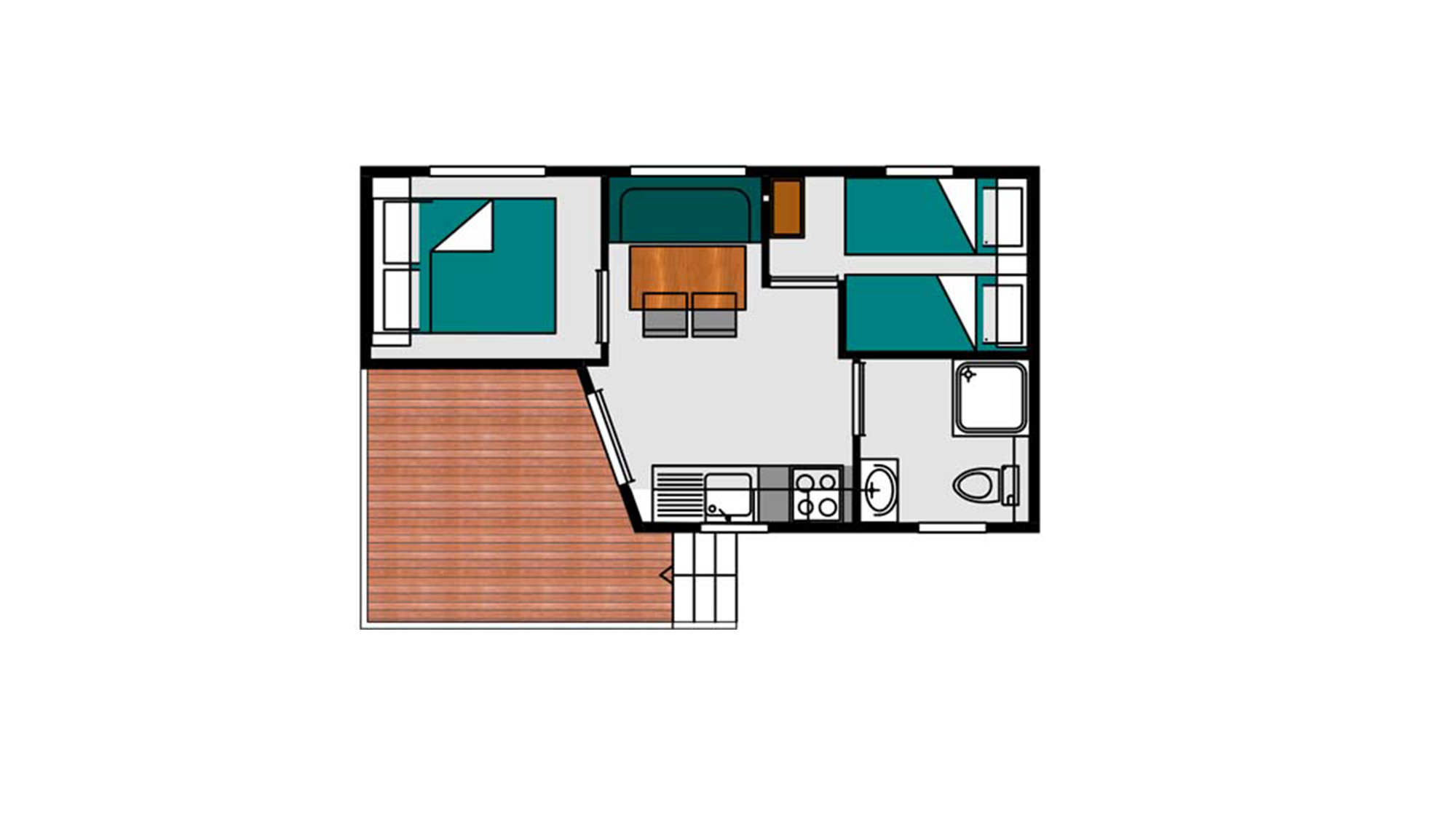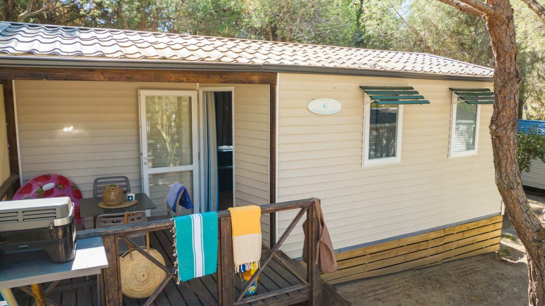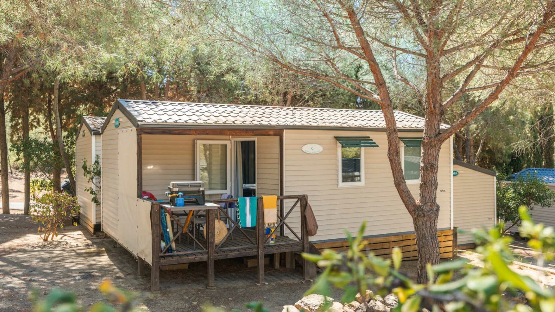 20m² + 7 m² Überdachte Terrasse, ein Zimmer mit einem Doppelbett (160 x 200), ein Zimmer mit zwei Einzelbetten (80 x 190), eine Sitzecke ausziehbar auf eine Liegefläche für zwei Personen (140 x 190), eine vollständig ausgestattete Küche. Ein Badezimmer mit Waschbecken, Dusche und WC. Gartenmöbel für den Außenbereich.