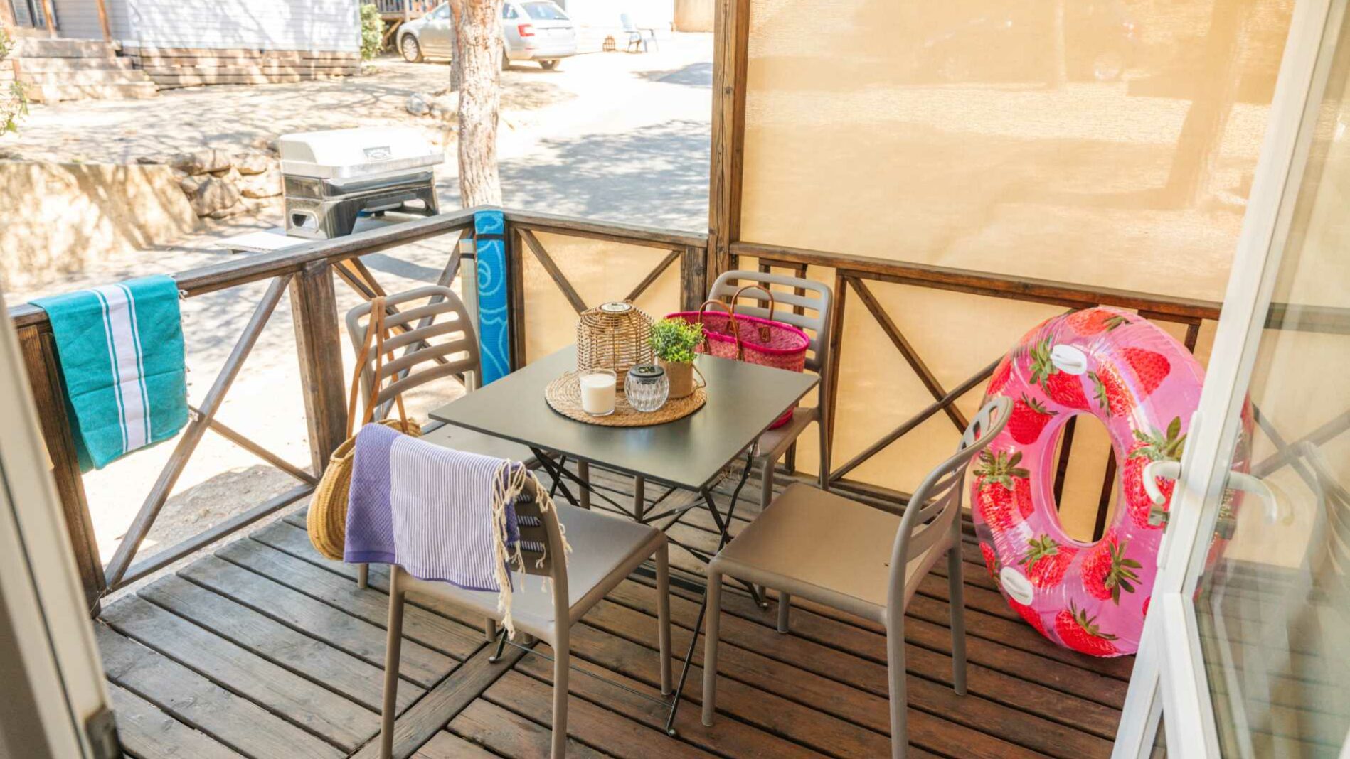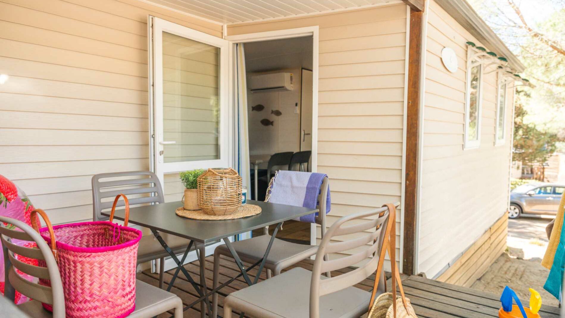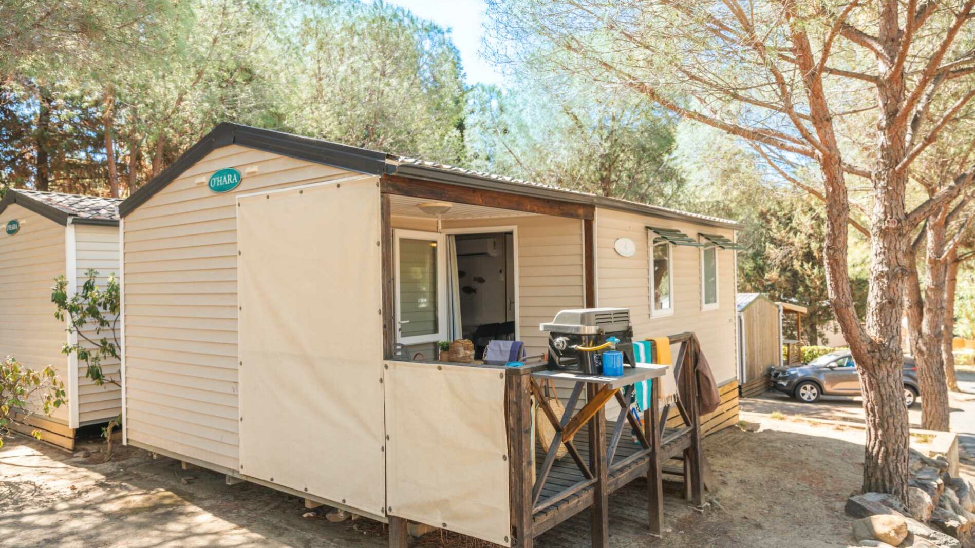 20m² + 7 m² Überdachte Terrasse, ein Zimmer mit einem Doppelbett (160 x 200), ein Zimmer mit zwei Einzelbetten (80 x 190), eine Sitzecke ausziehbar auf eine Liegefläche für zwei Personen (140 x 190), eine vollständig ausgestattete Küche. Ein Badezimmer mit Waschbecken, Dusche und WC. Gartenmöbel für den Außenbereich.