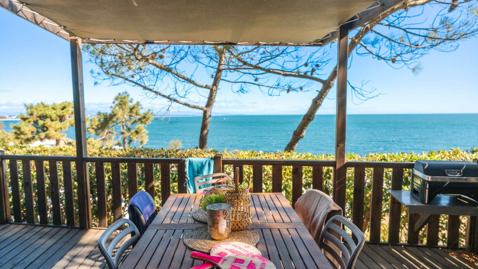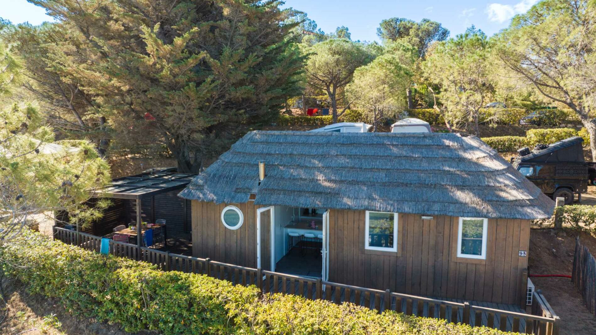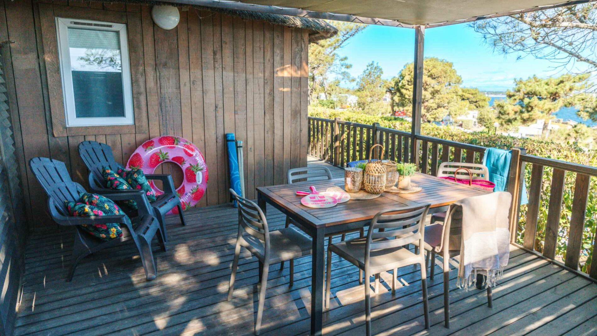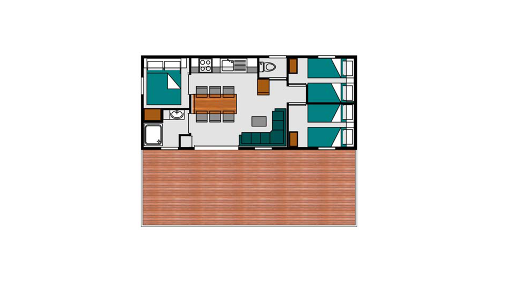 34 m² + 20m² Überdachte Terrasse, ein Doppelzimmer (160 x 200), zwei Zimmer mit 2 Einzelbetten (80 x 190), Sitzecke, Große komplett ausgestattete Küche mit Insel, Badezimmer mit XXL Dusche (100x 80), Waschbecken, 1 separat WC. Gartenmöbel.