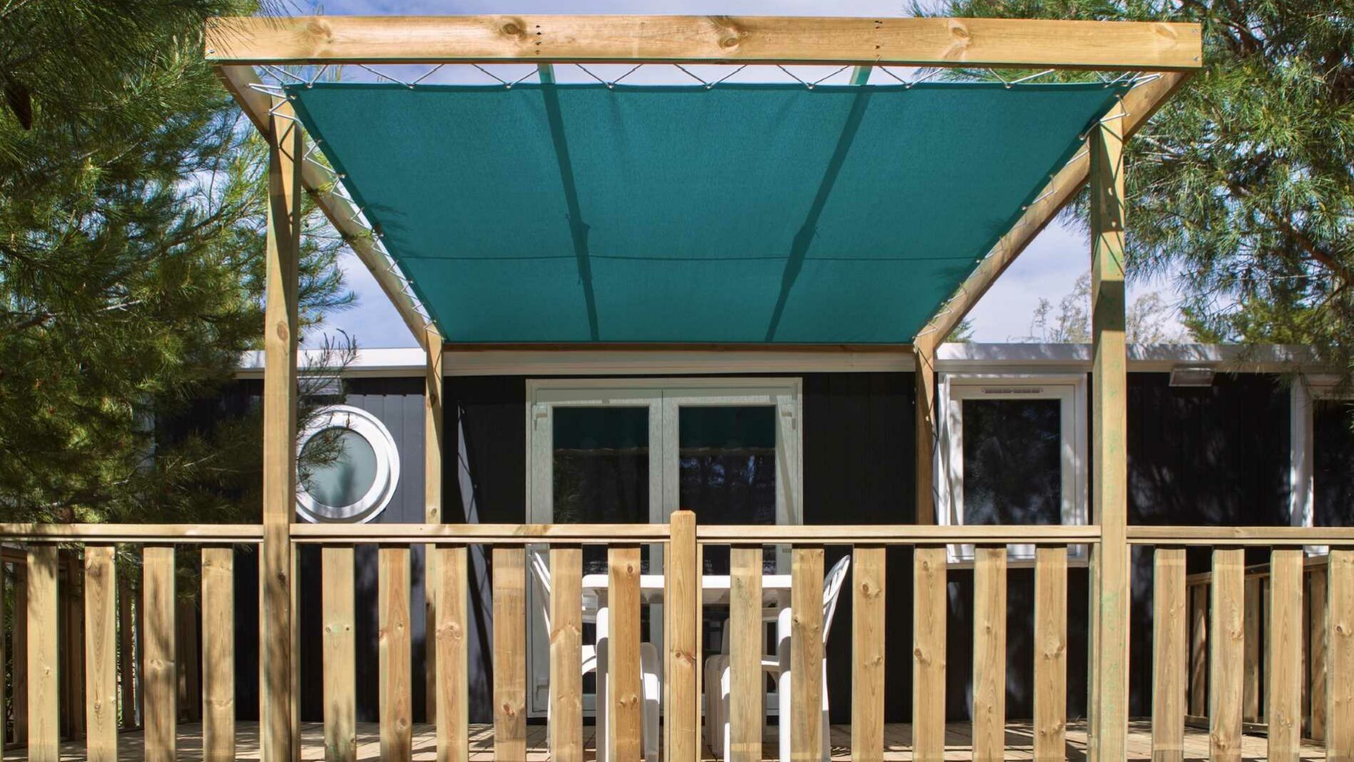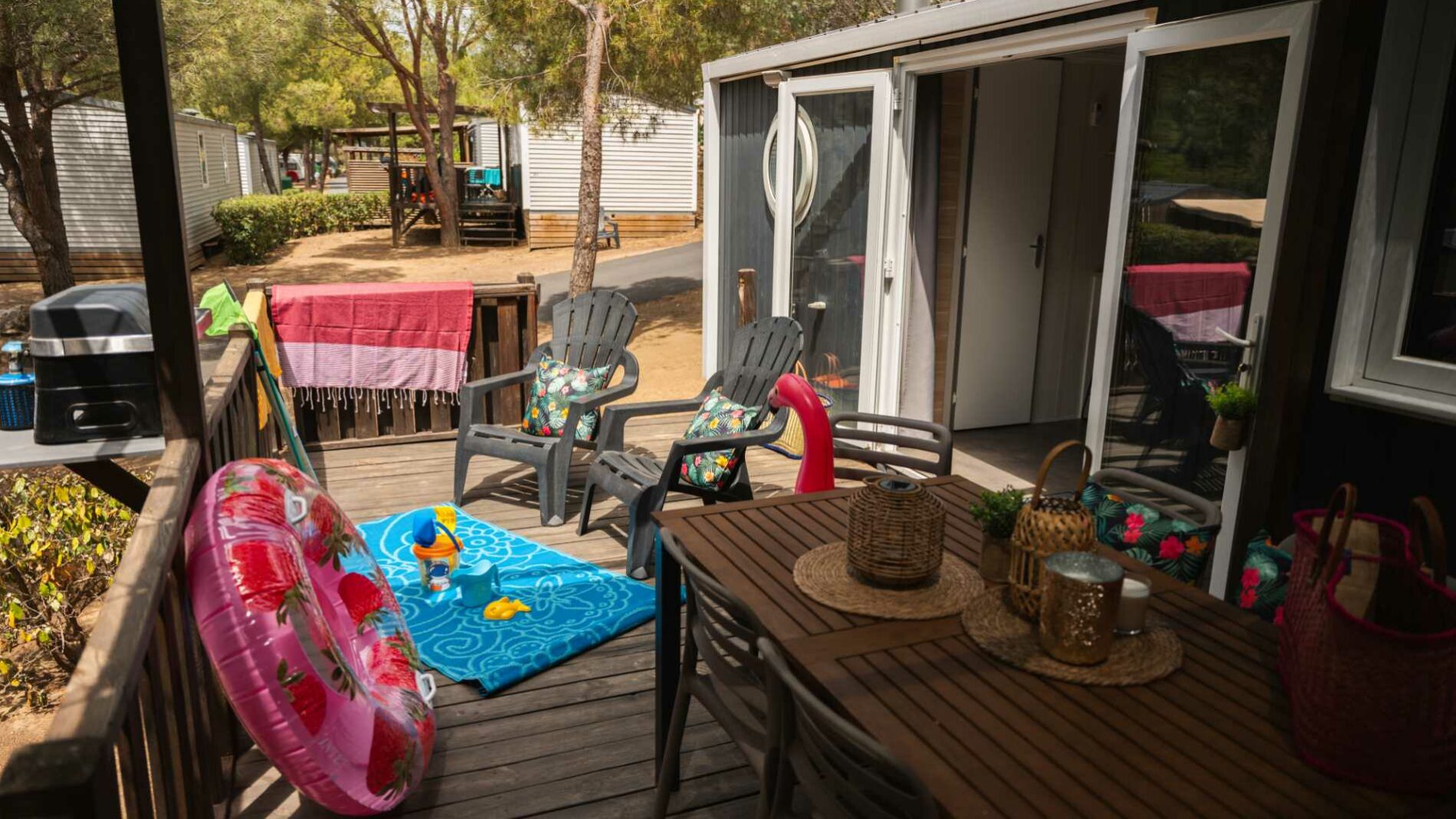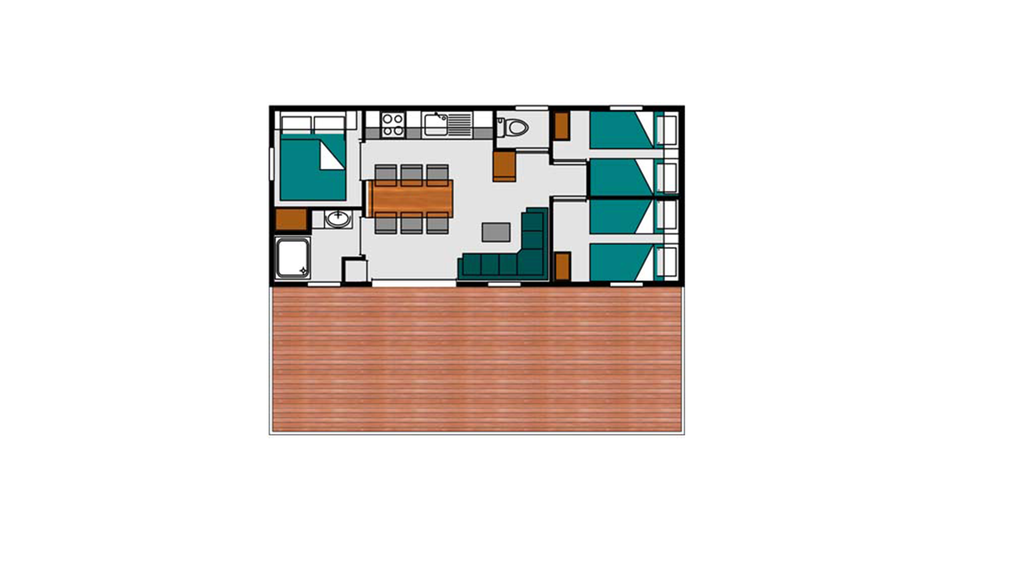 34 m² + 20m² Überdachte Terrasse, ein Doppelzimmer (160 x 200), zwei Zimmer mit 2 Einzelbetten (80 x 190), Sitzecke, Große komplett ausgestattete Küche mit Insel, Badezimmer mit XXL Dusche (100x 80), Waschbecken, 1 separat WC. Gartenmöbel.